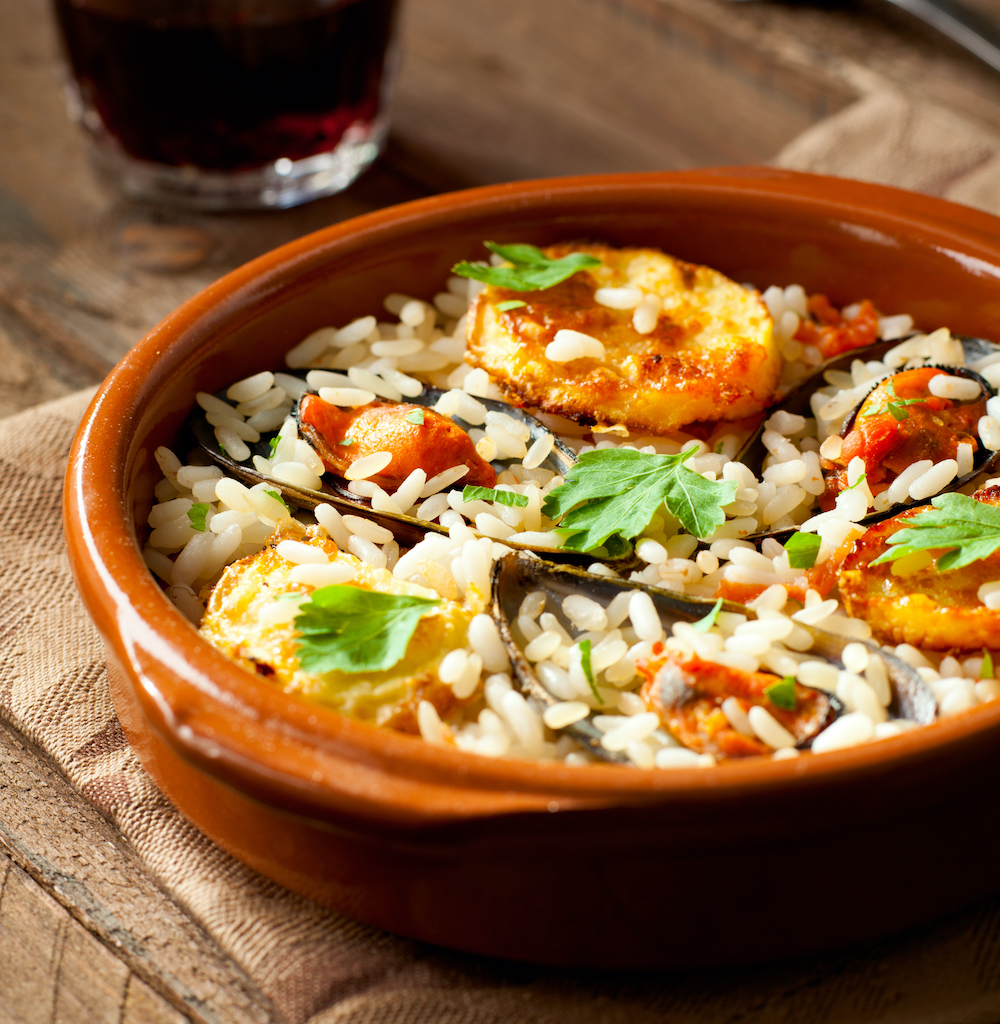 Il nome ci porta inevitabilmente a fare un paragone con la paella spagnola, di cui la tiella è senz’altro cugina, visto l’influsso dei Borboni in Italia. Proprio questa dinastia, una volta giunta in Puglia, influenzò la cucina locale introducendo piatti della propria tradizione. Come la paella, anche la tiella è un piatto contadino, realizzato con ingredienti facilmente reperibili da chi lavorava la terra: riso, patate e altre verdure di campo. Inizialmente le cozze non erano parte della ricetta, ma non appena il piatto raggiunse la costa, soprattutto quella di Taranto (famosa per la miticoltura), i frutti di mare diventarono uno degli ingredienti principali della tiella.