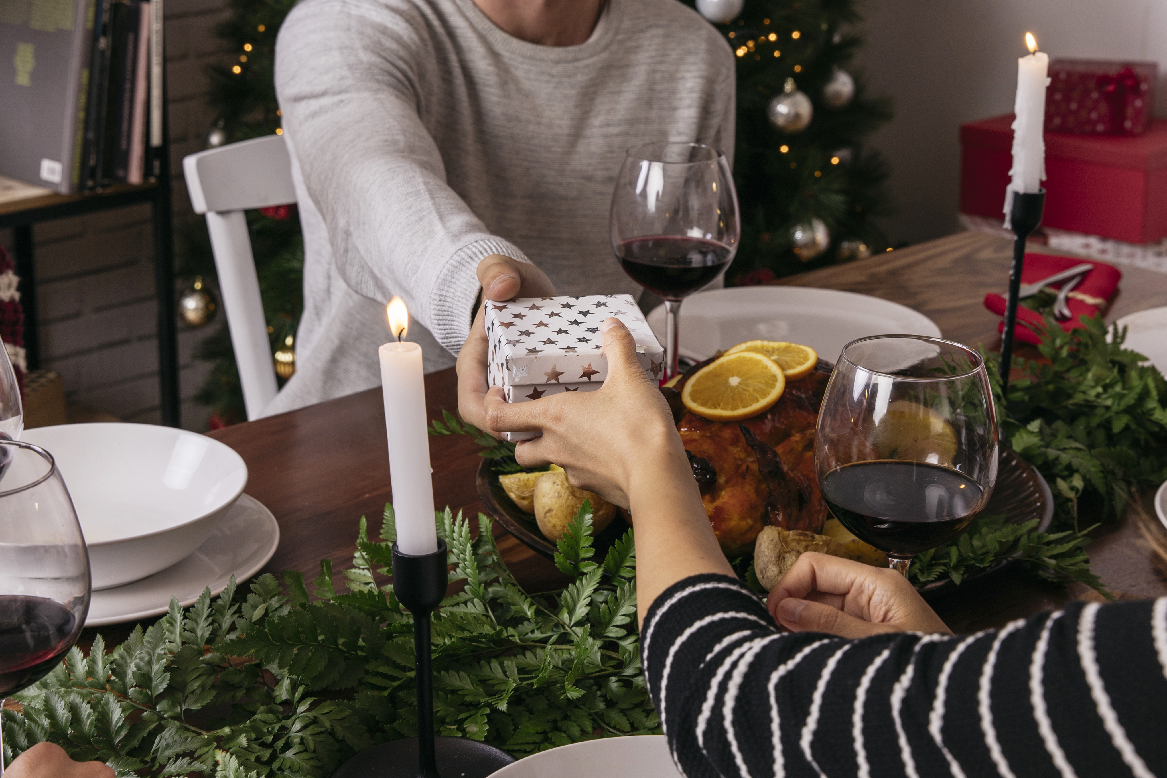 Organizza un angolo dedicato ai doni, magari sotto l'albero di Natale. Puoi optare per un tradizionale scambio di regali o per un gioco come il "Secret Santa", in cui ogni ospite riceve un regalo da una persona segreta.