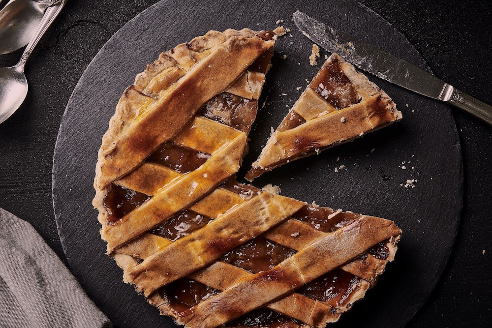Torta coi bischeri: l'aspetto è quello di una crostata che in un guscio di croccante pasta frolla racchiude una golosa farcia a base di riso, cioccolato e vari tipi di frutta secca.
